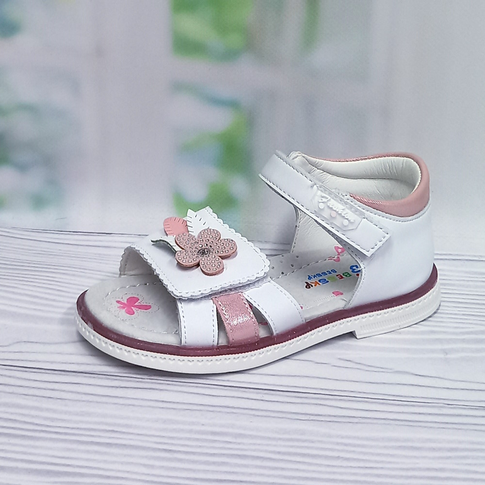 👡 Дитячі босоніжки для дівчинки ТМ Bessky — легке літнє взуття у білому кольорі з відкритим носком і закритою п’яткою. Верх із гладкої екошкіри, зручні застібки на липучках дозволяють точно відрегулювати модель по ніжці, змінюючи ширину стопи. Вбудований супінатор забезпечує комфорт під час ходьби. Акуратна квіточка додає образу святковості та ніжності.