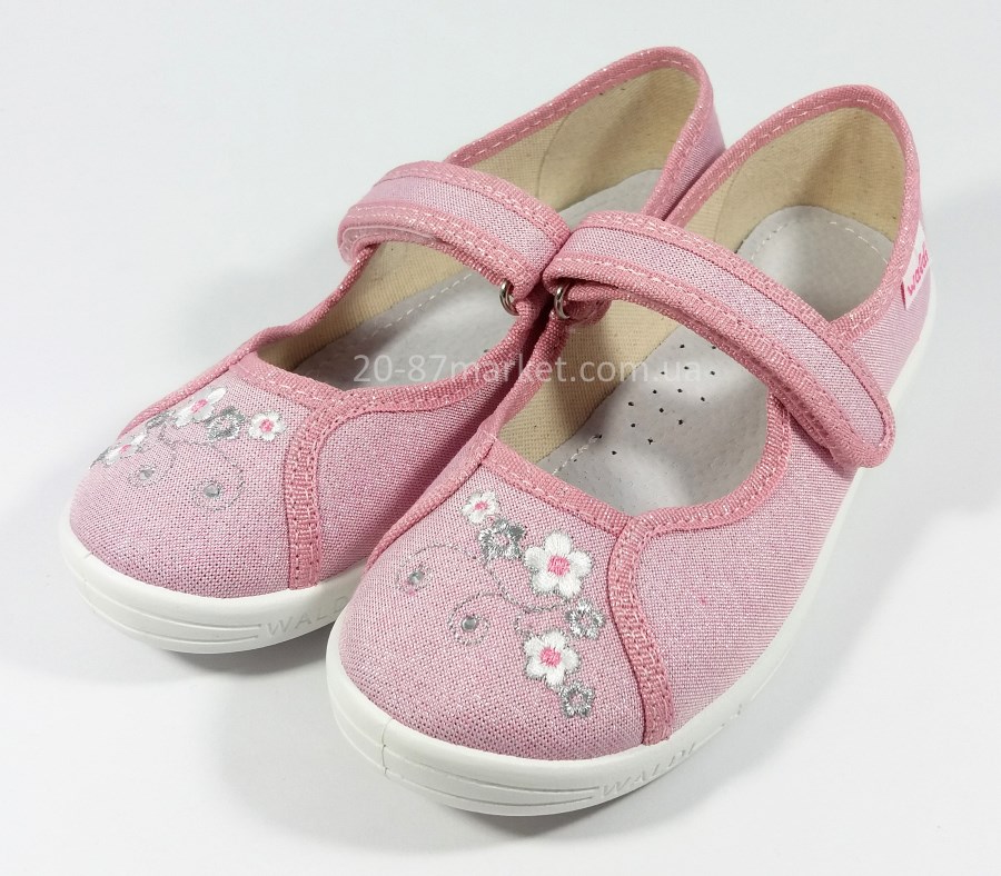 Рожеві капці для дівчинки на липучках, вишивка - квіточки. Шкіряна устілка, супінатор. Підошва білого кольору.