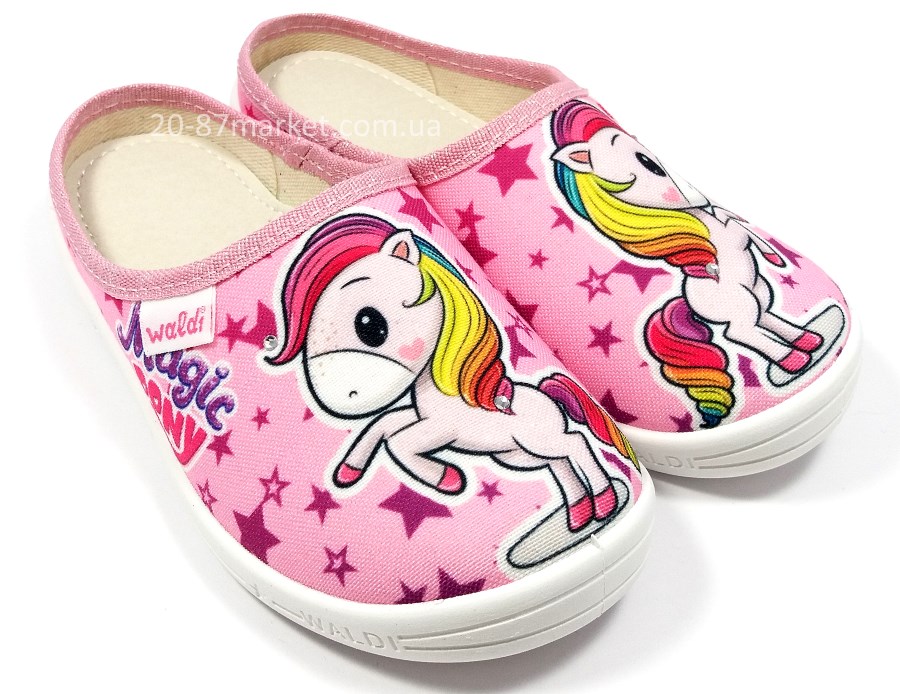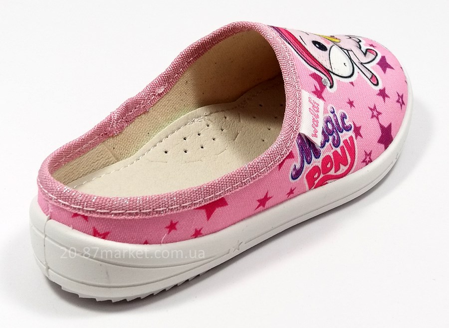 Рожеві капці без задника для дівчинки, з принтом поні. Шкіряна устілка, супінатор, підошва білого кольору.