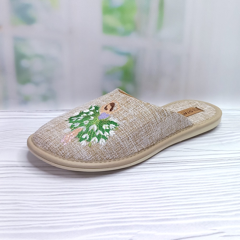 Бежеві домашні капці ТМ Белста виготовлені з дихаючого текстилю, із закритим носком і відкритою п’яткою. Прикрашені акуратною вишивкою. Зносостійка поліуретанова підошва заввишки 1 см забезпечує легкість і комфорт при ходьбі. Ідеальний варіант для щоденного використання вдома.