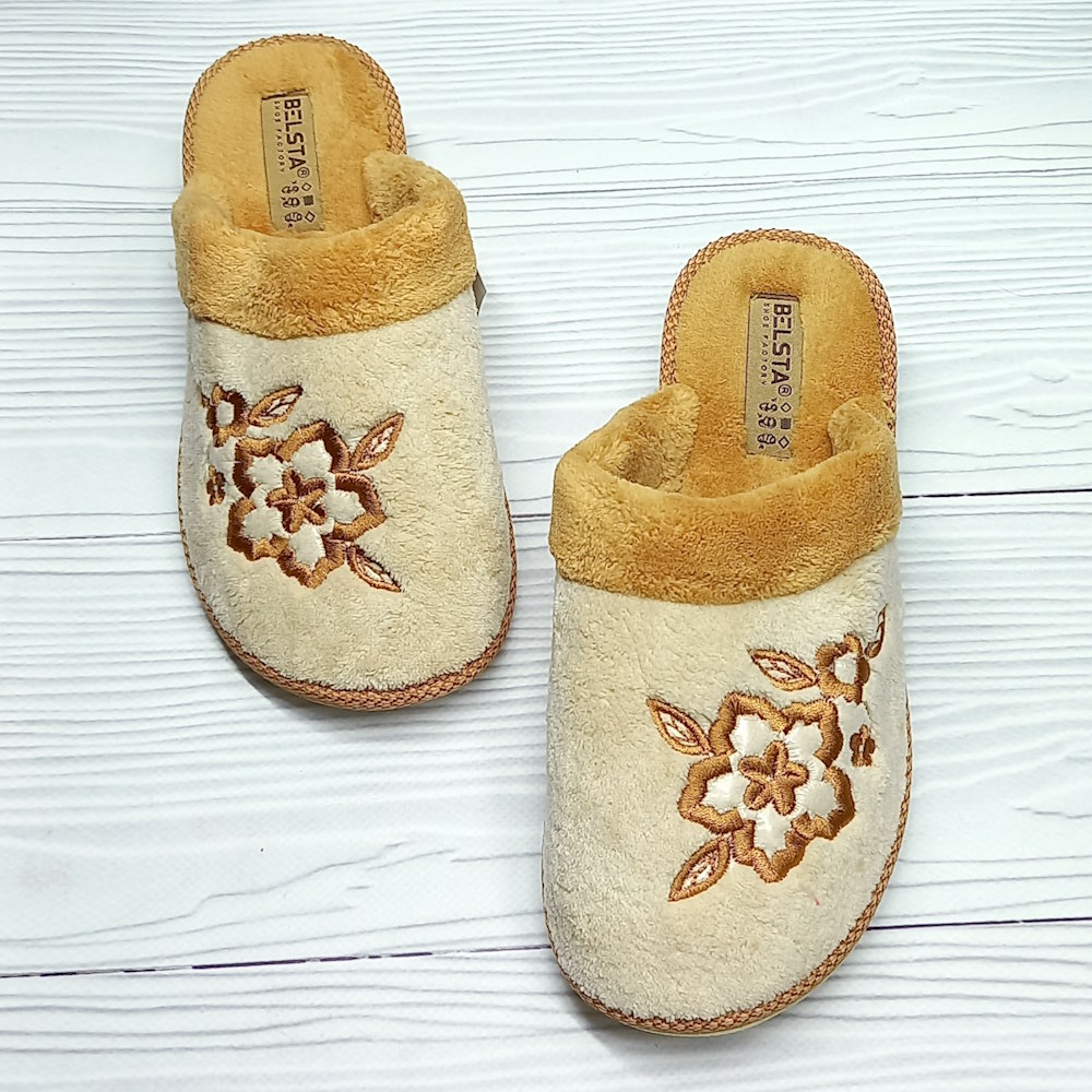 Жіночі кімнатні капці ТМ Белста — зручна модель для домашнього затишку та відпочинку. Махровий верх бежевого кольору приємний до ноги, добре утримує тепло та забезпечує вентиляцію. Закритий носок захищає від прохолоди, а відкрита п’ятка робить капці зручними для щоденного використання. Текстильна устілка додає м’якості під час ходьби, а міцна поліуретанова підошва заввишки 2,5 см біля п’ятки вирізняється зносостійкістю та стабільністю.