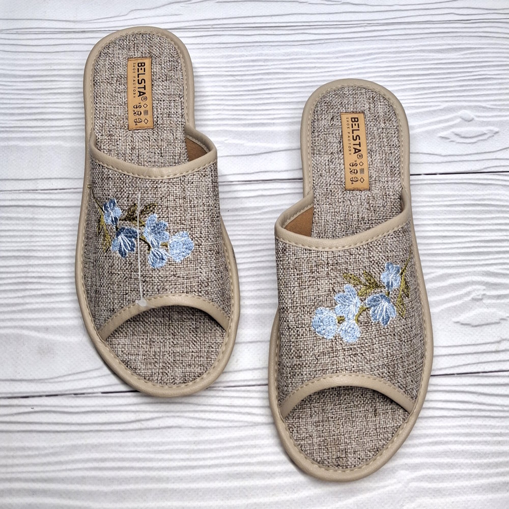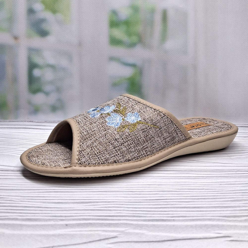 Жіночі домашні капці ТМ Белста — легкі та практичні капці для щоденного домашнього комфорту. Модель виконана з якісного текстилю бежевого кольору, прикрашена стильною вишивкою, має відкритий носок і п’яту для свободи та вентиляції. Текстильна устілка забезпечує м’якість під час ходьби, міцна поліуретанова підошва стійка до зношування, а невелика висота п’яти 2 см додає зручності. Ідеальний вибір для затишку та комфорту щодня.