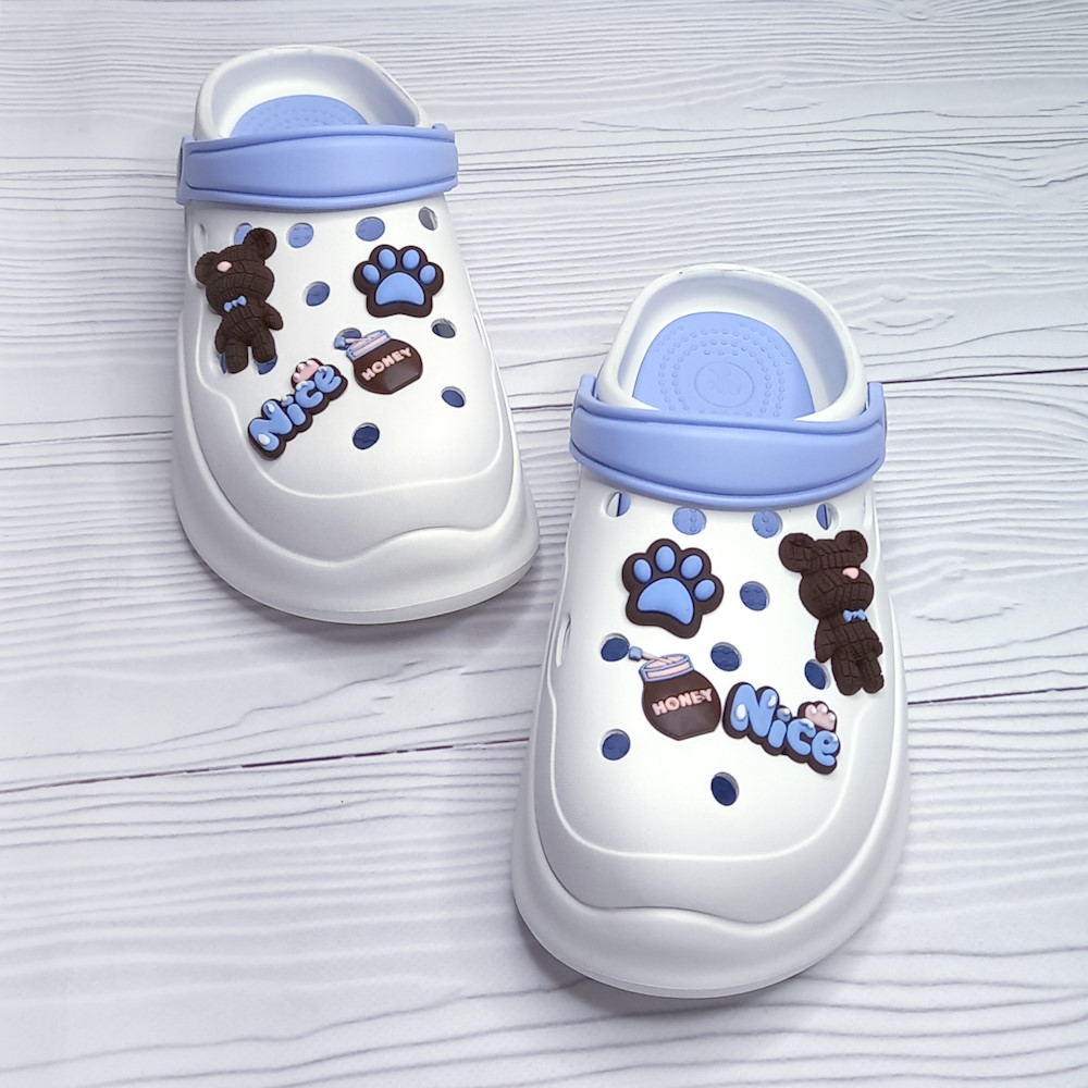 Крокси білого кольору з блакитним від Jose Amorales — зручна пара для літа. Висока платформа надає стилю, джибітси додають оригінальності. Матеріал легко миється та не боїться вологи. Підійдуть для щоденного носіння, відпочинку або пляжу.