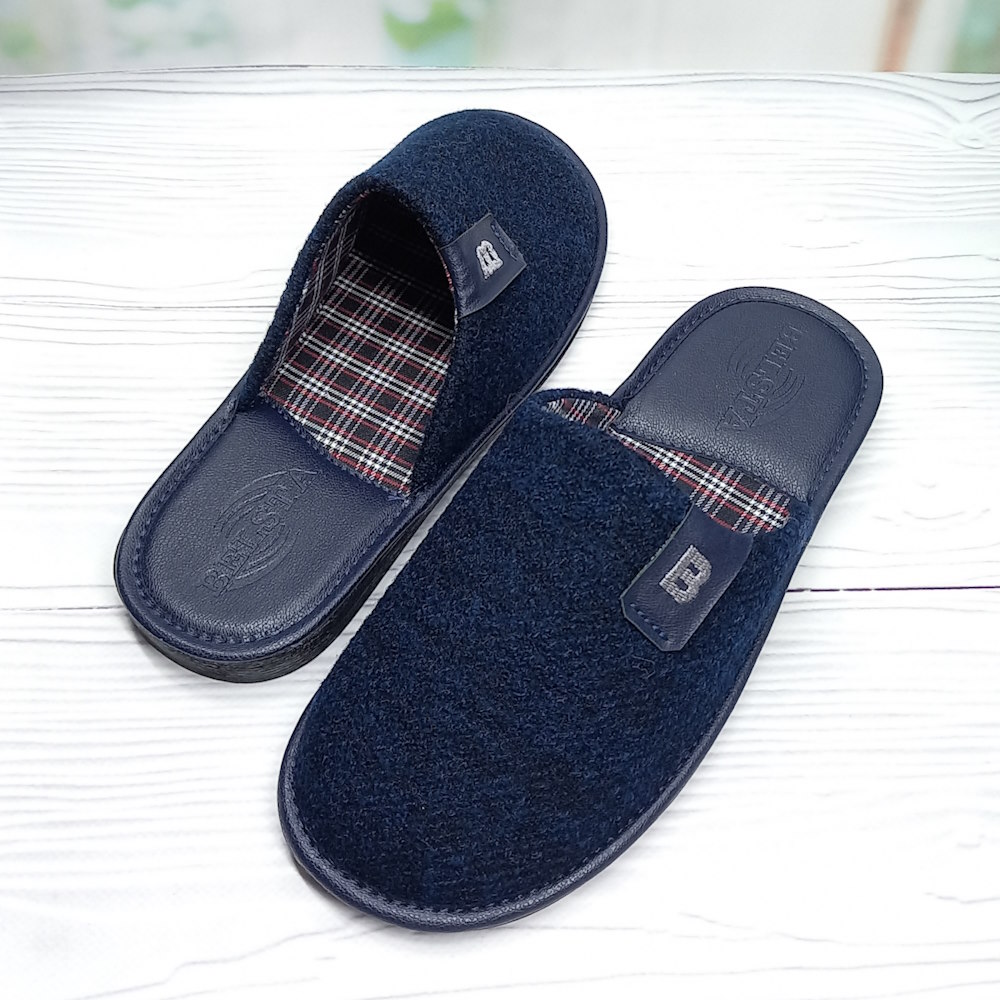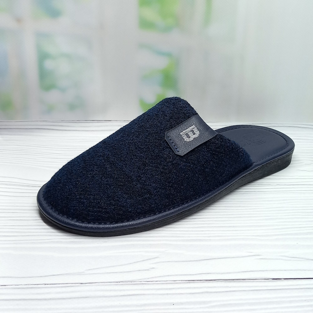Капці виконані в насиченому синьому кольорі, закритий носок захищає стопу, а відкрита п’ятка забезпечує легкість під час носіння, верх із вмістом шерсті дарує тепло та затишок.