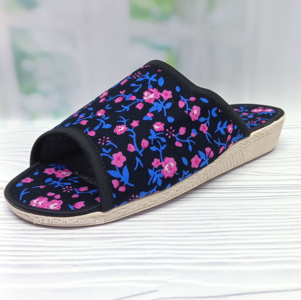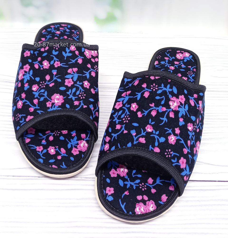Жіночі домашні капці тм Белста, квітковий принт.. Устілка текстильна, відкритий носок. Висота п'яти 2,5 см. Підошва з ПВХ.
