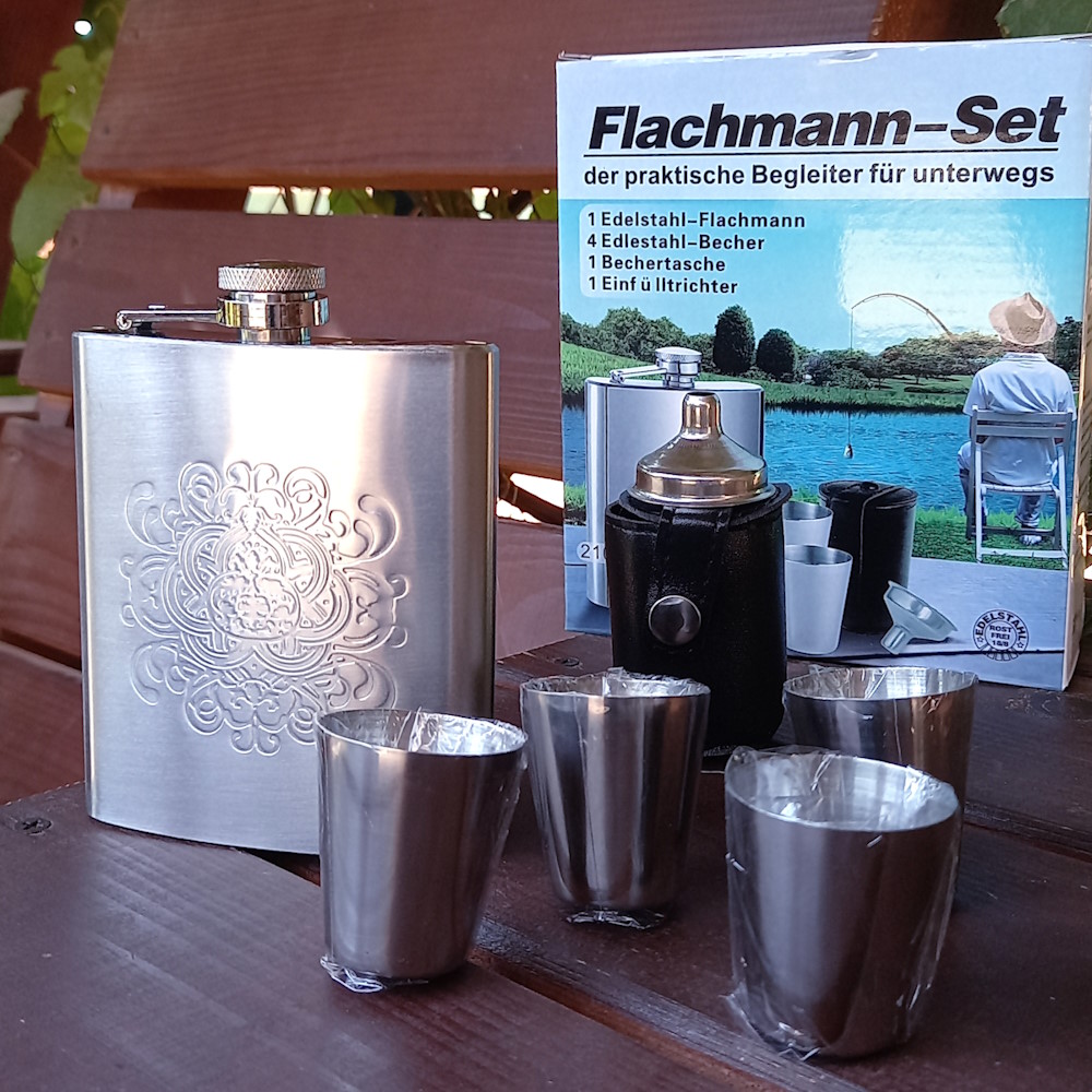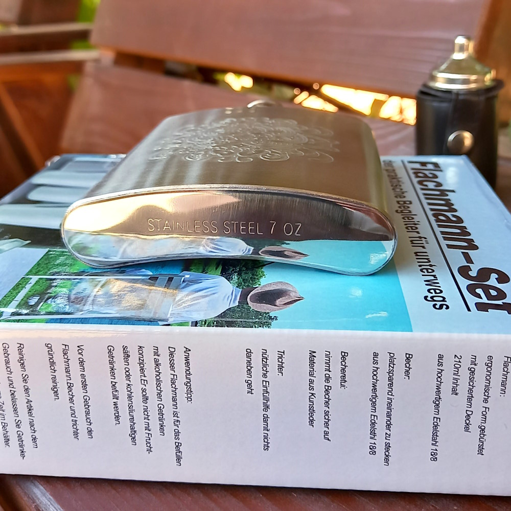 Практичний набір для активного відпочинку, риболовлі або виїзду на природу. У комплекті металева фляга об'ємом 210 мл з нержавіючої сталі, зручна лійка для переливання та 4 стопки. Упаковано в подарункову коробку — не потребує додаткового оформлення.